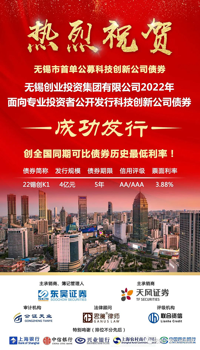 | 無錫創(chuàng)投集團成功發(fā)行無錫市首單公募科技創(chuàng)新公司債券 |