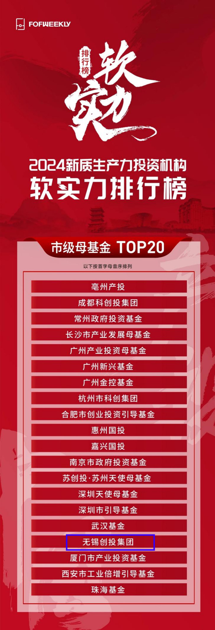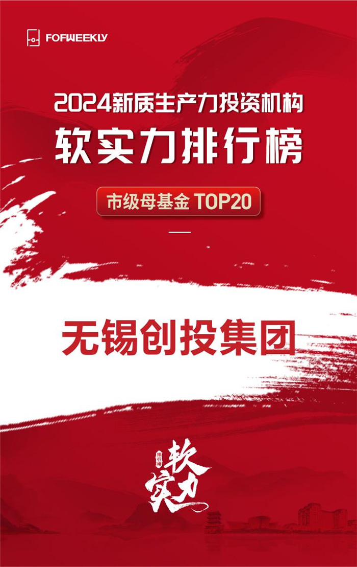 近日,《母基金周刊》(FOFWEEKLY)公布其年度排名“2024新質(zhì)生產(chǎn)力投資機構(gòu)軟實力排行榜”,無錫創(chuàng)投集團(tuán)榮登“2024新質(zhì)生產(chǎn)力投資機構(gòu)軟實力排行榜—市級母基金 TOP20”。
